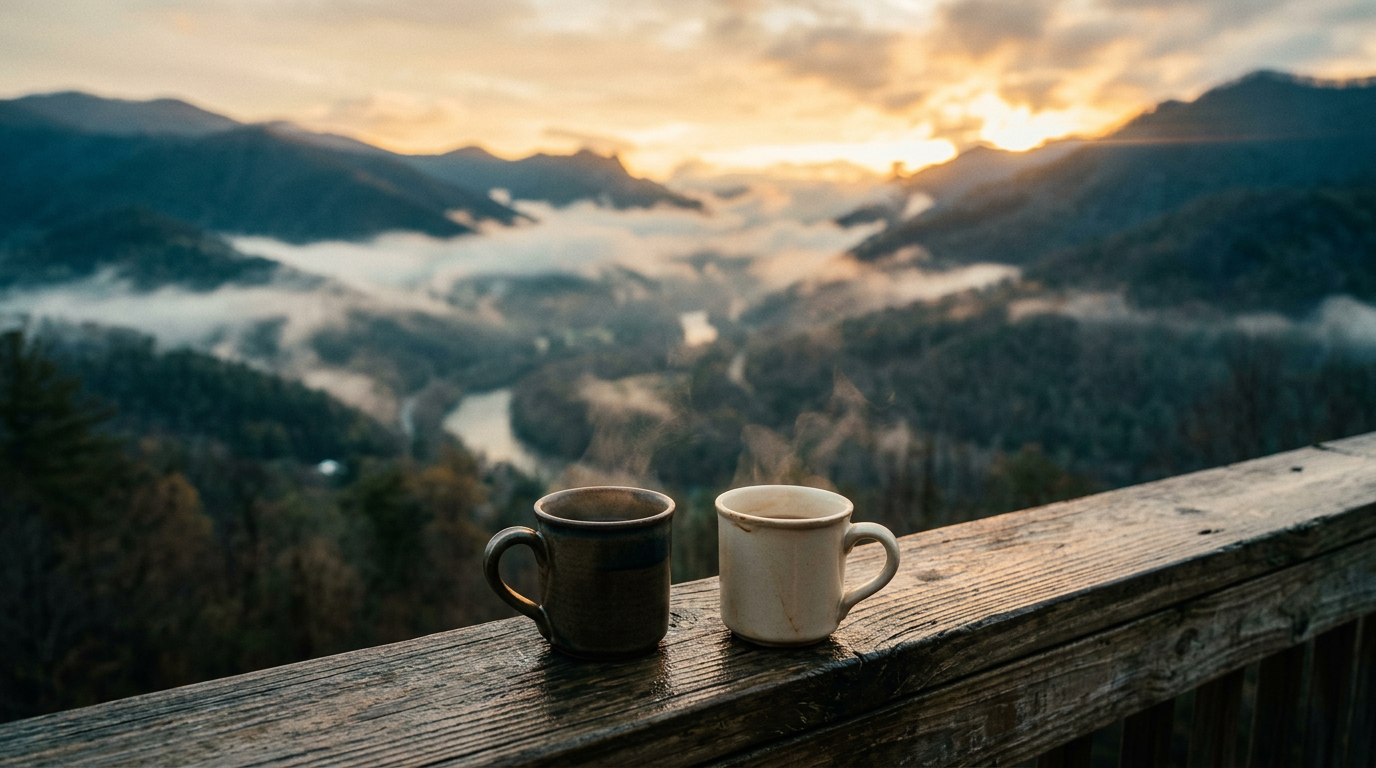 The valley stretched out below — fog burning off the river in pale ribbons. Morning was doing what morning does: arriving without asking.